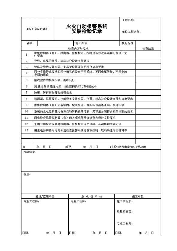 SH/T 3503-J511 火灾自动报警系统安装检验记录