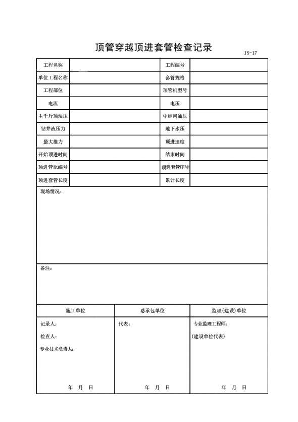 表格名称:JS-17 顶管穿越顶进套管检查记录
