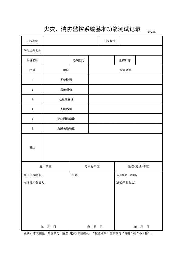 表格名称:ZK-19 火灾、消防监控系统基本功能测试记录