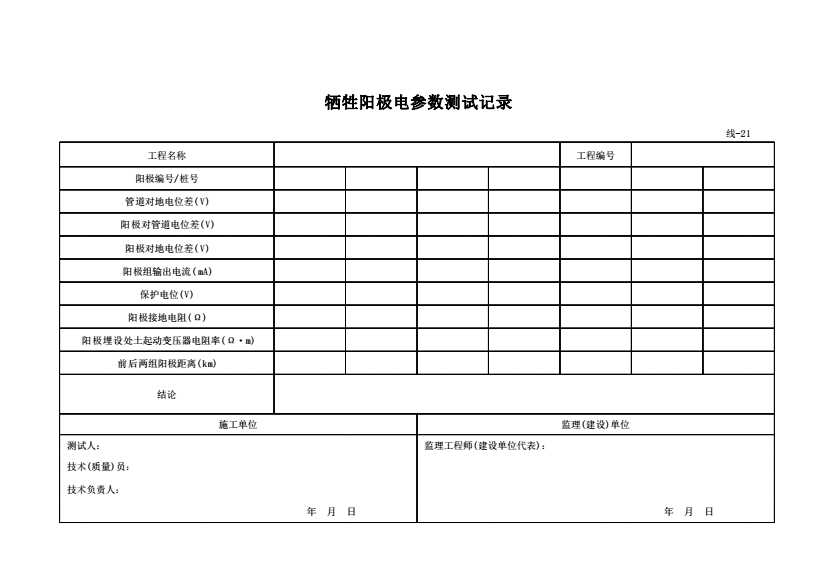表格名称:线-21 牺牲阳极电参数测试记录