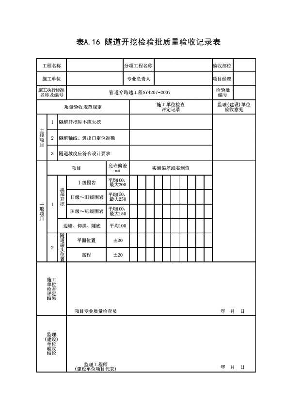 表格名称:表A.16 隧道开挖检验批质量验收记录表