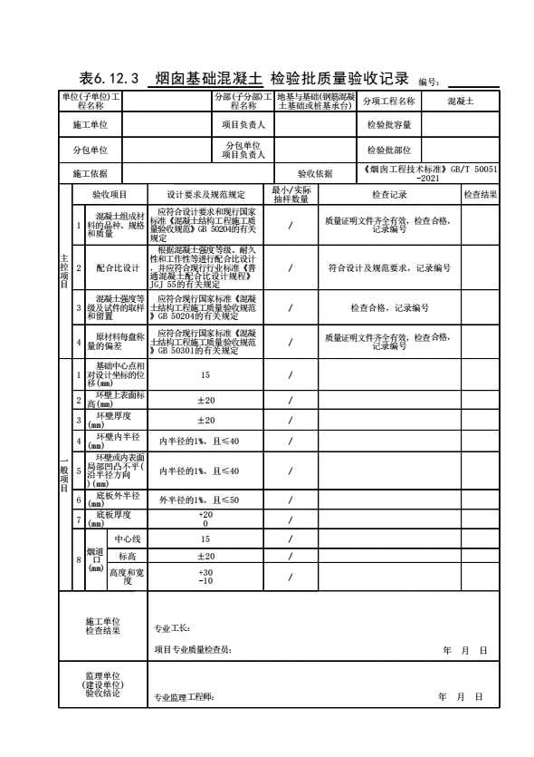 表格名称:表6.12.3 烟囱基础混疑土检验批质量验收记录