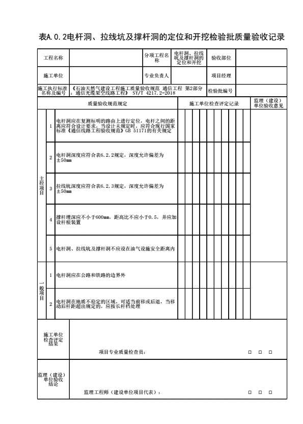表格名称:表A.0.2 电杆洞、拉线坑及撑杆洞的定位和开挖检验批质量验收记录