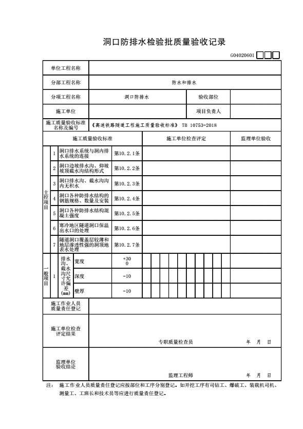 表格名称:G04020601 洞口防排水检验批质量验收记录