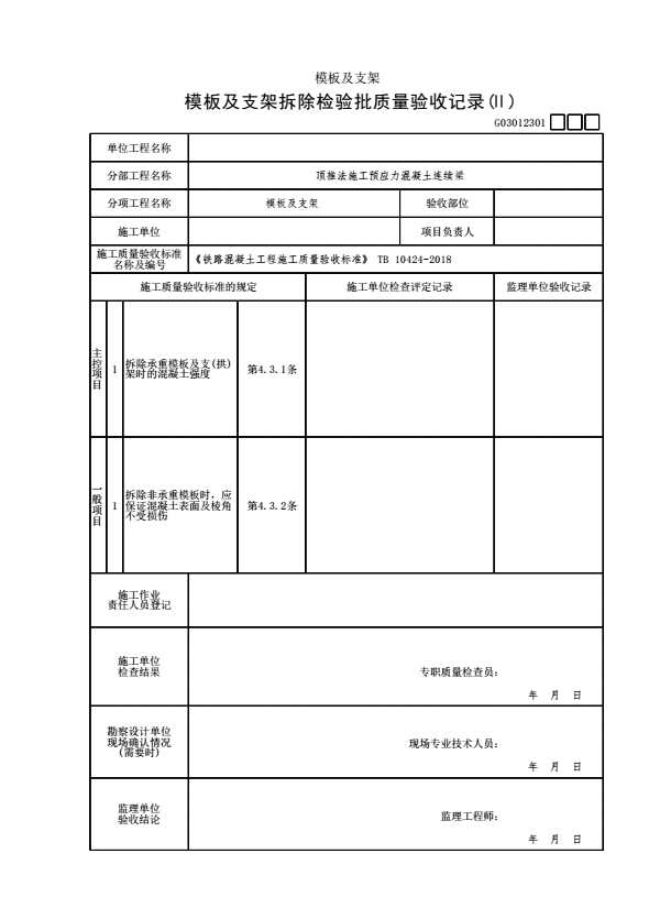 表格名称:G03012301 【模板及支架】模板及支架拆除检验批质量验收记录(Ⅱ)