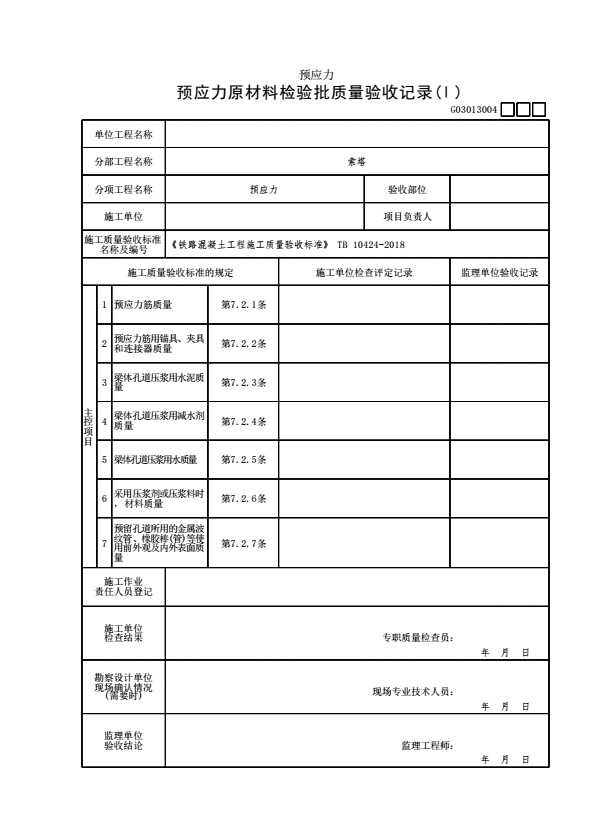 表格名称:G03013004 【预应力】预应力原材料检验批质量验收记录(Ⅰ)