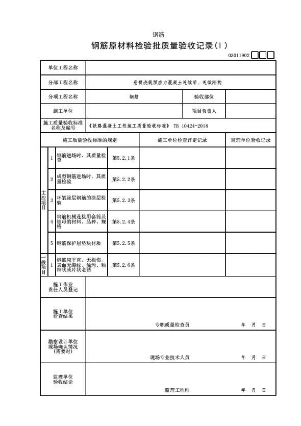 表格名称:03011902 钢筋原材料检验批质量验收记录(Ⅰ)