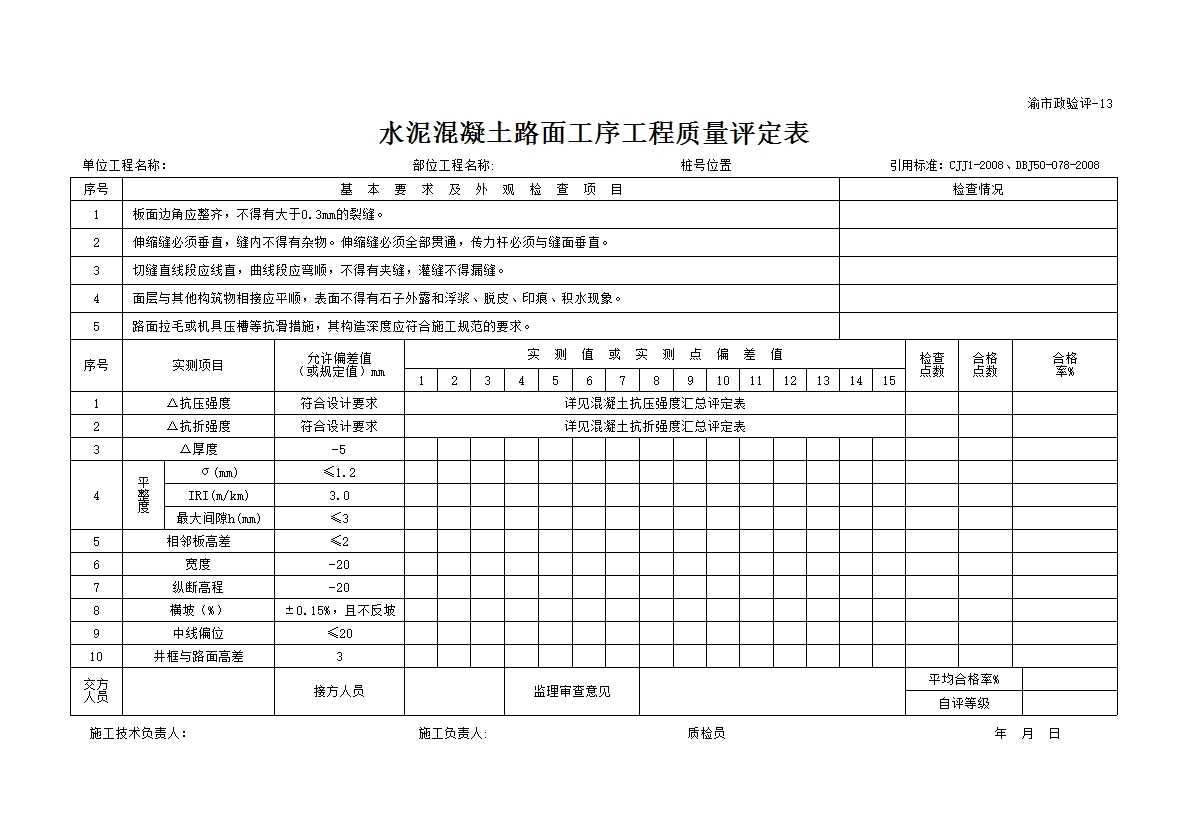 表格名称:13 水泥混凝土路面工序工程质量评定表