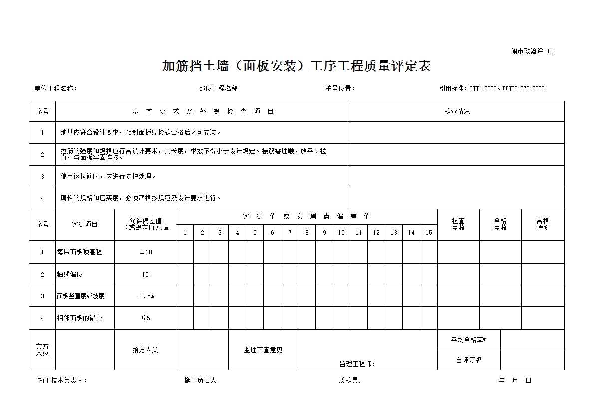 表格名称:18 加筋挡土墙(面板安装)工序工程质量评定表