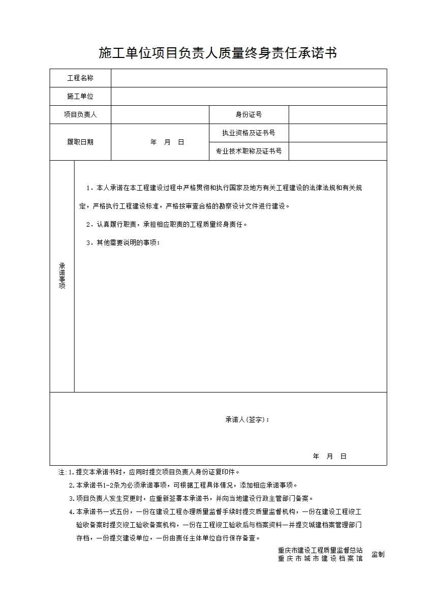 表格名称:质量责任-15 施工单位项目负责人质量终身责任承诺书