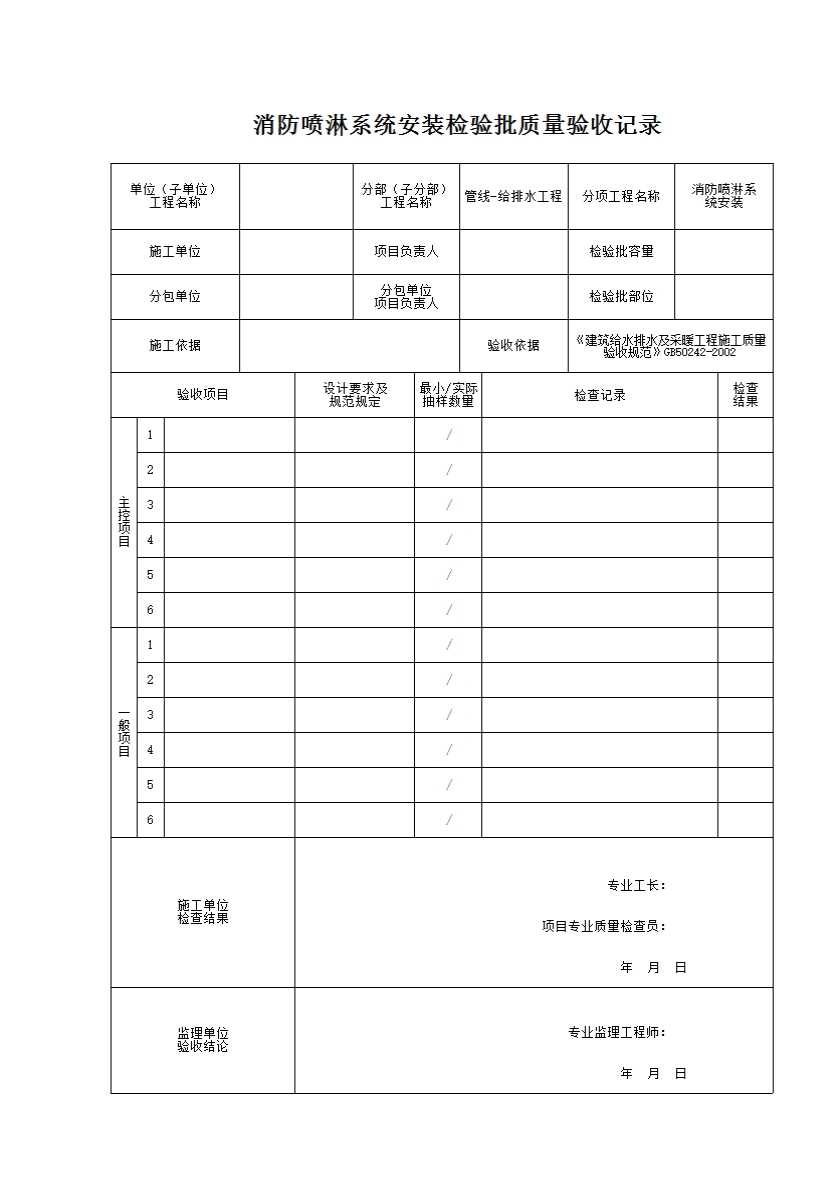 表格名称:消防喷淋系统安装检验批质量验收记录