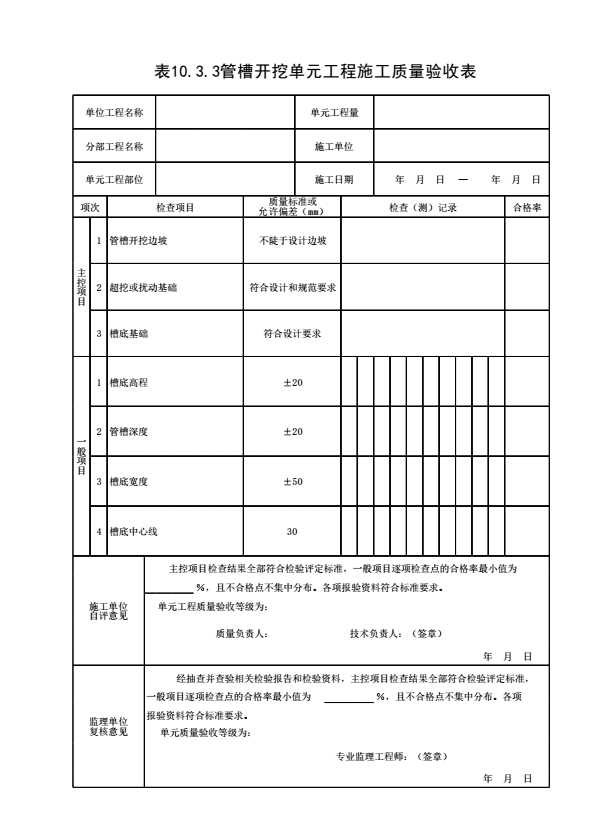 表10.3.3 管槽开挖单元工程施工质量验收表