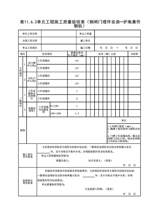 表格名称:表11.6.2 单元工程施工质量验收表(钢闸门埋件安装—护角兼作侧轨)