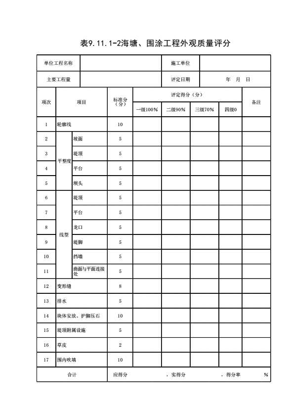 表格名称:表9.11.1-2 海塘、围涂工程外观质量评分