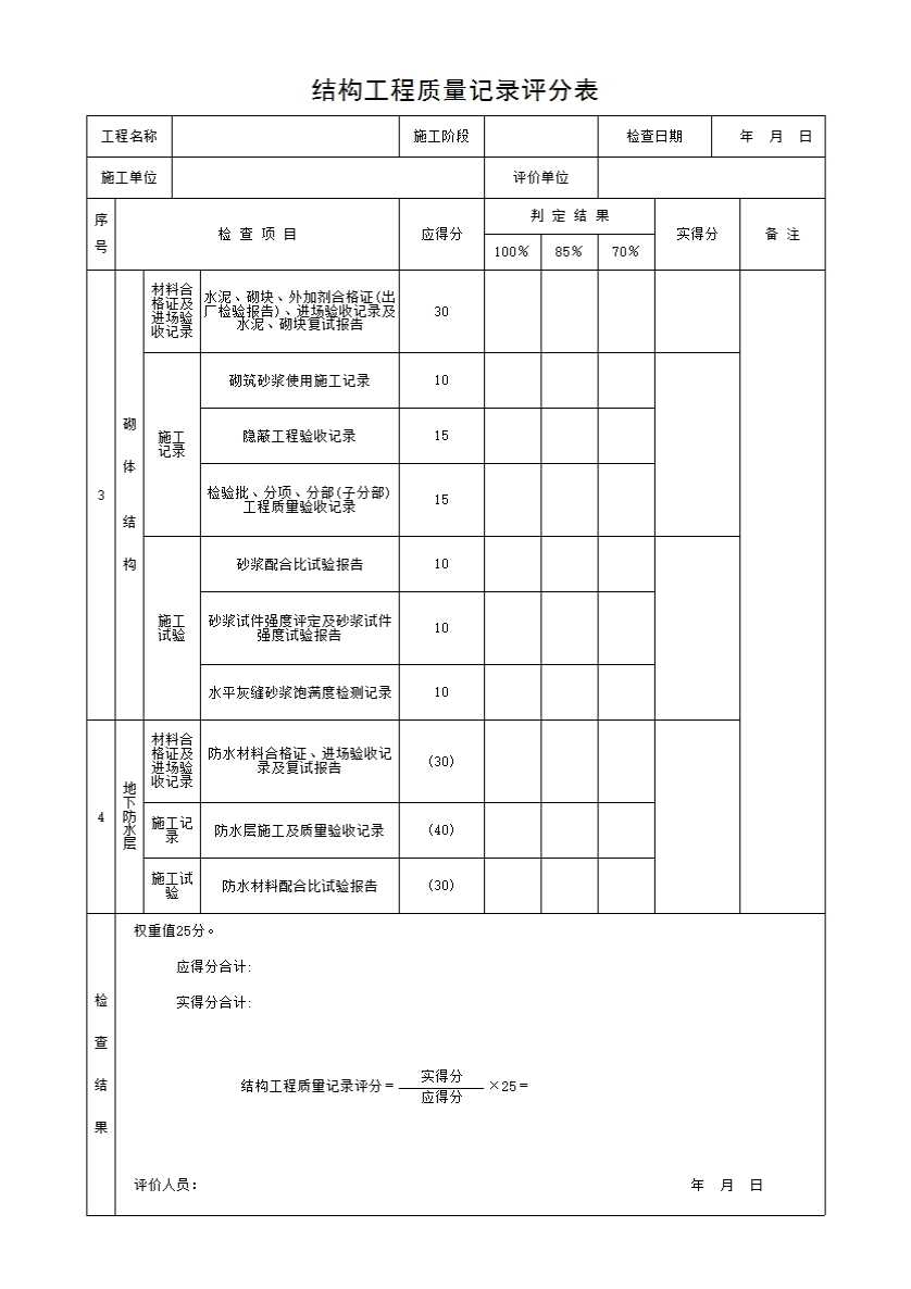 结构工程质量记录评分表