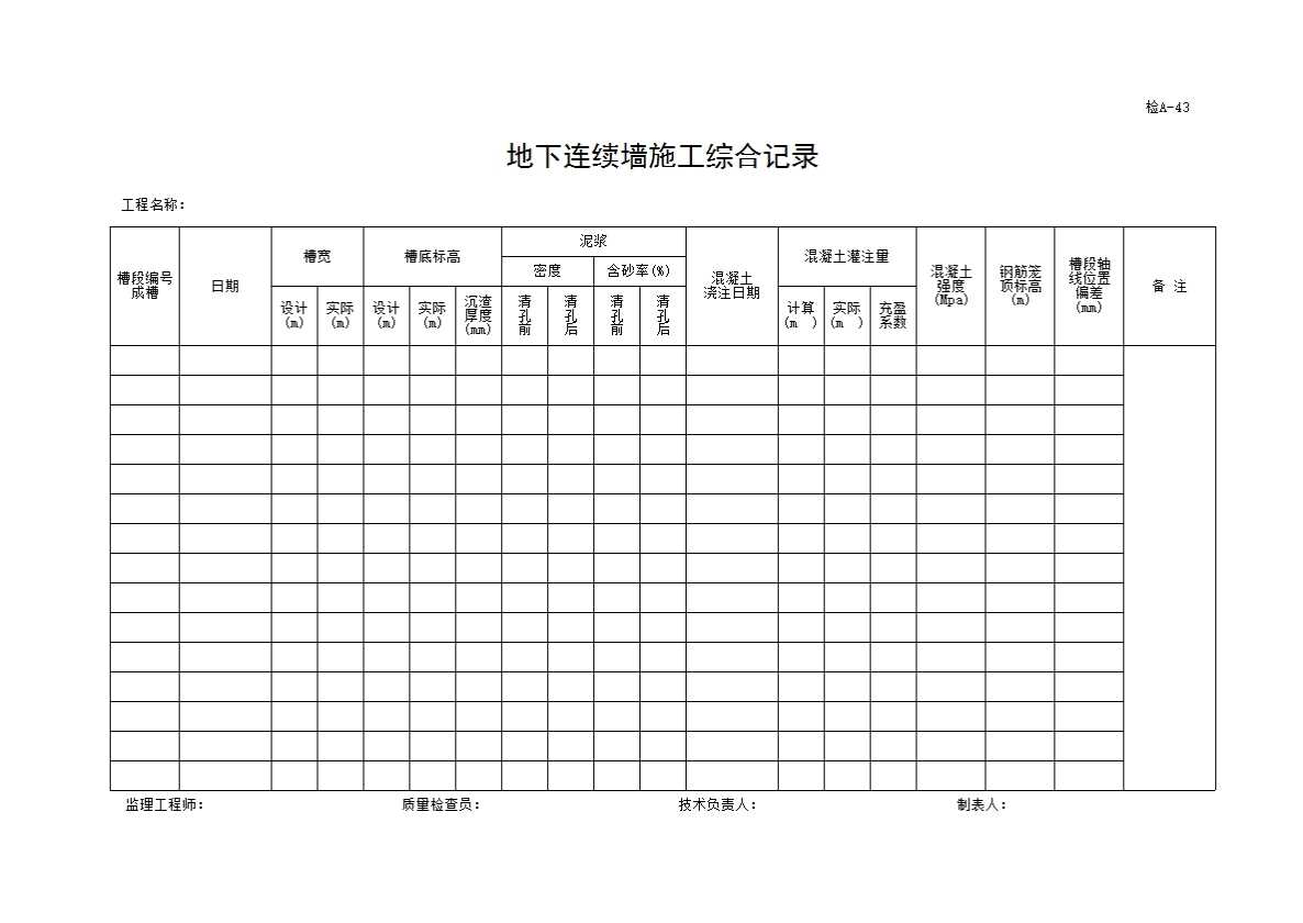 表格名称:43、(评A-43)地下连续墙施工综合记录