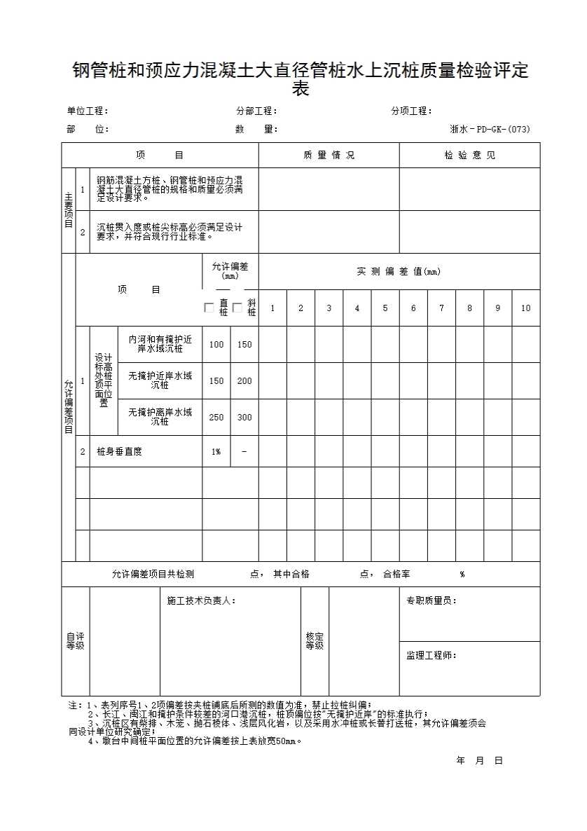 表格名称:073 钢管桩和预应力混凝土大直径管桩水上沉桩质量检验评定表