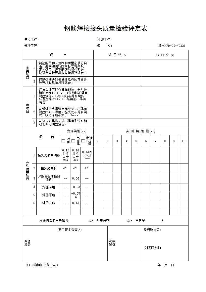 表格名称:023 钢筋焊接接头质量检验评定表