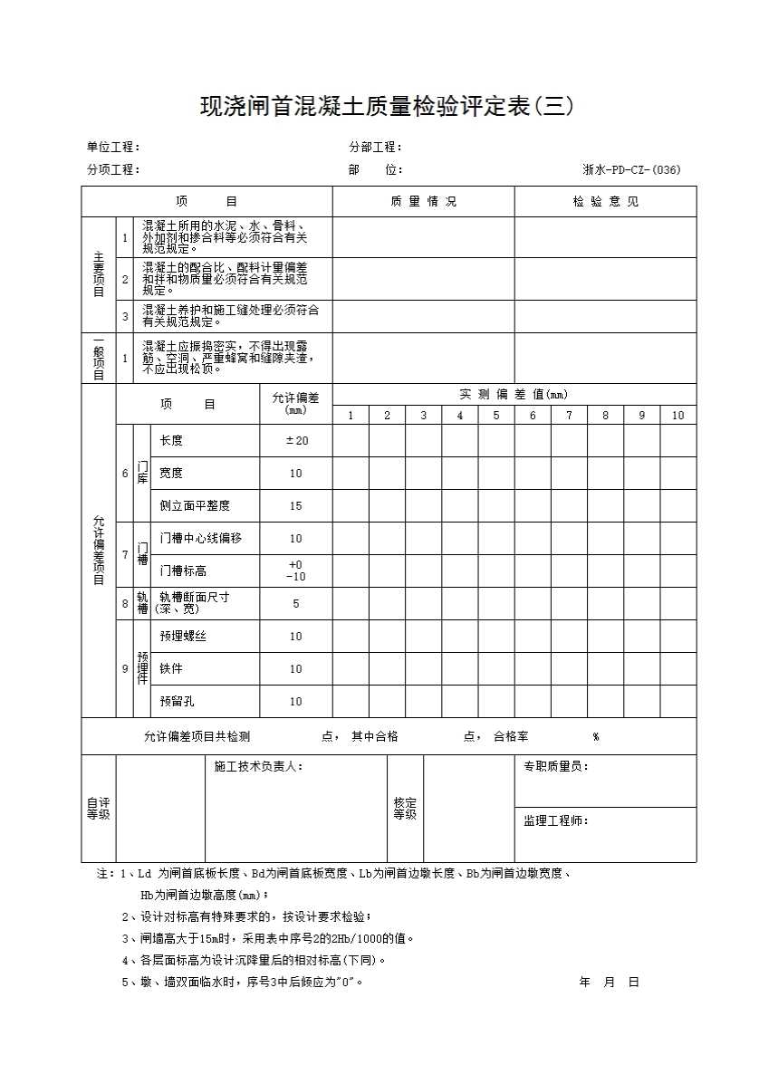 表格名称:036 现浇闸首混凝土质量检验评定表(三)