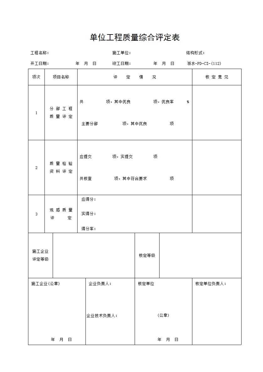 表格名称:112 单位工程质量综合评定表