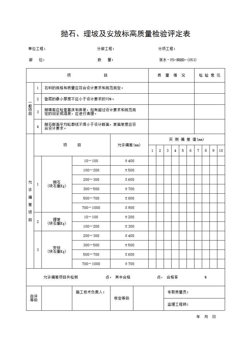 表格名称:053 抛石、理坡及安放标高质量检验评定表