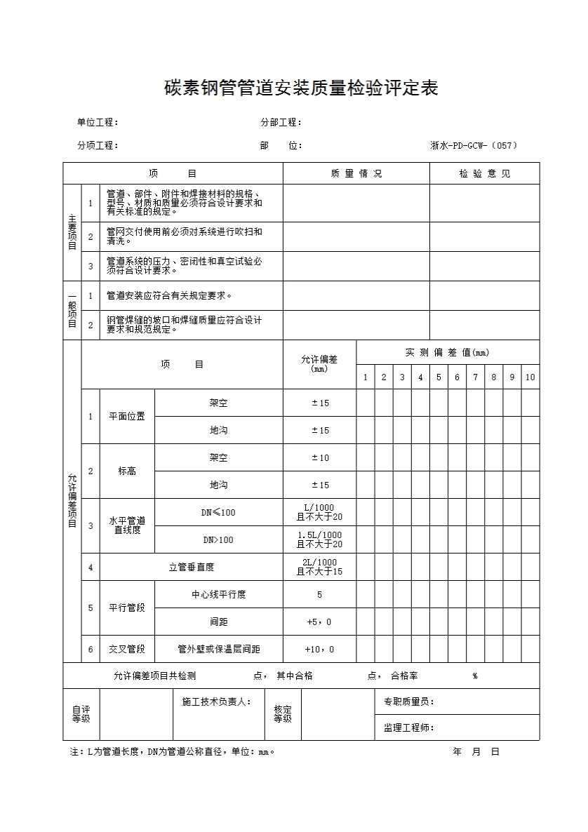 表格名称:057 碳素钢管管道安装质量检验评定表