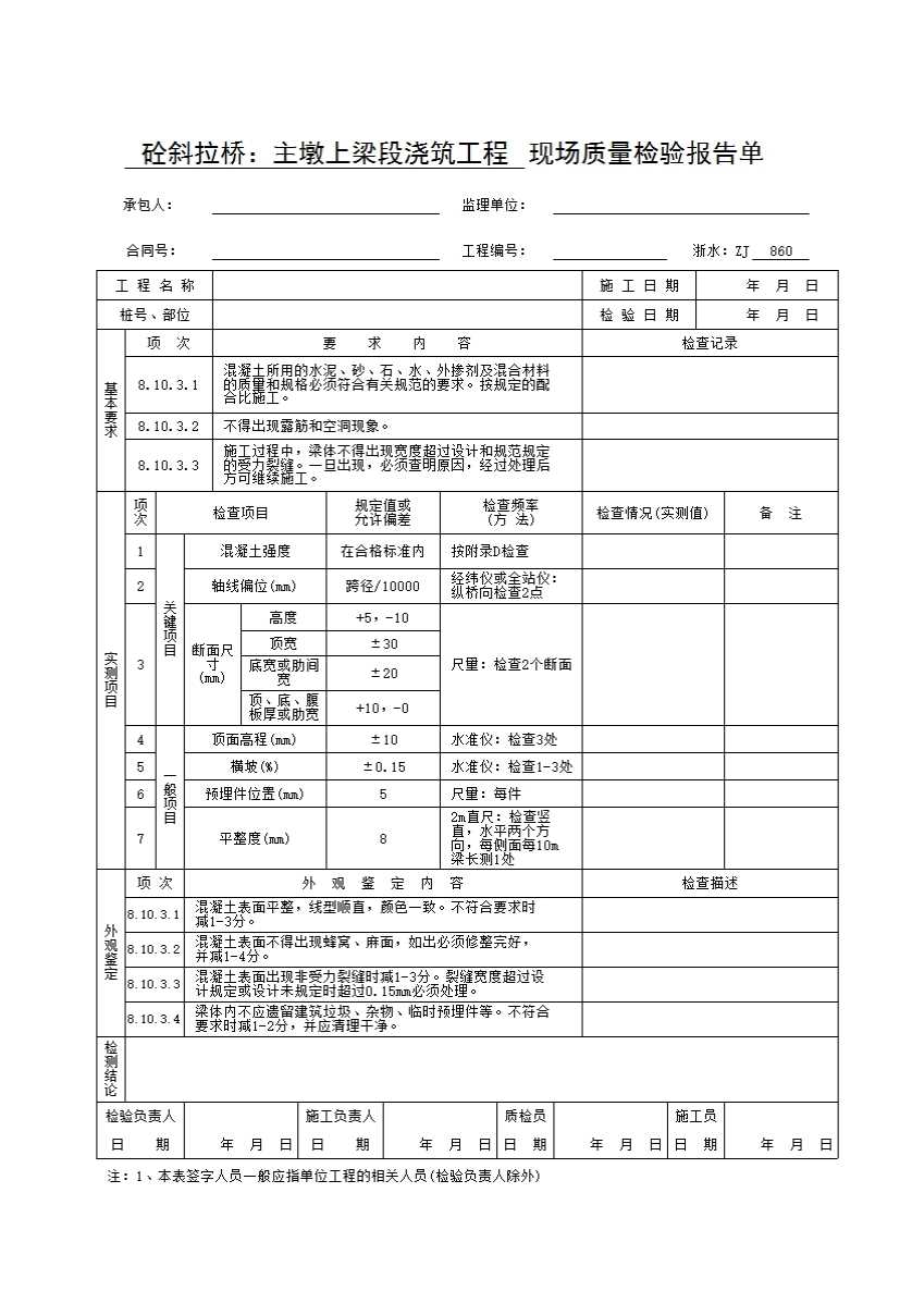 表格名称:浙水:ZJ860 砼斜拉桥:主墩上梁段浇筑工程现场质量检验报告单