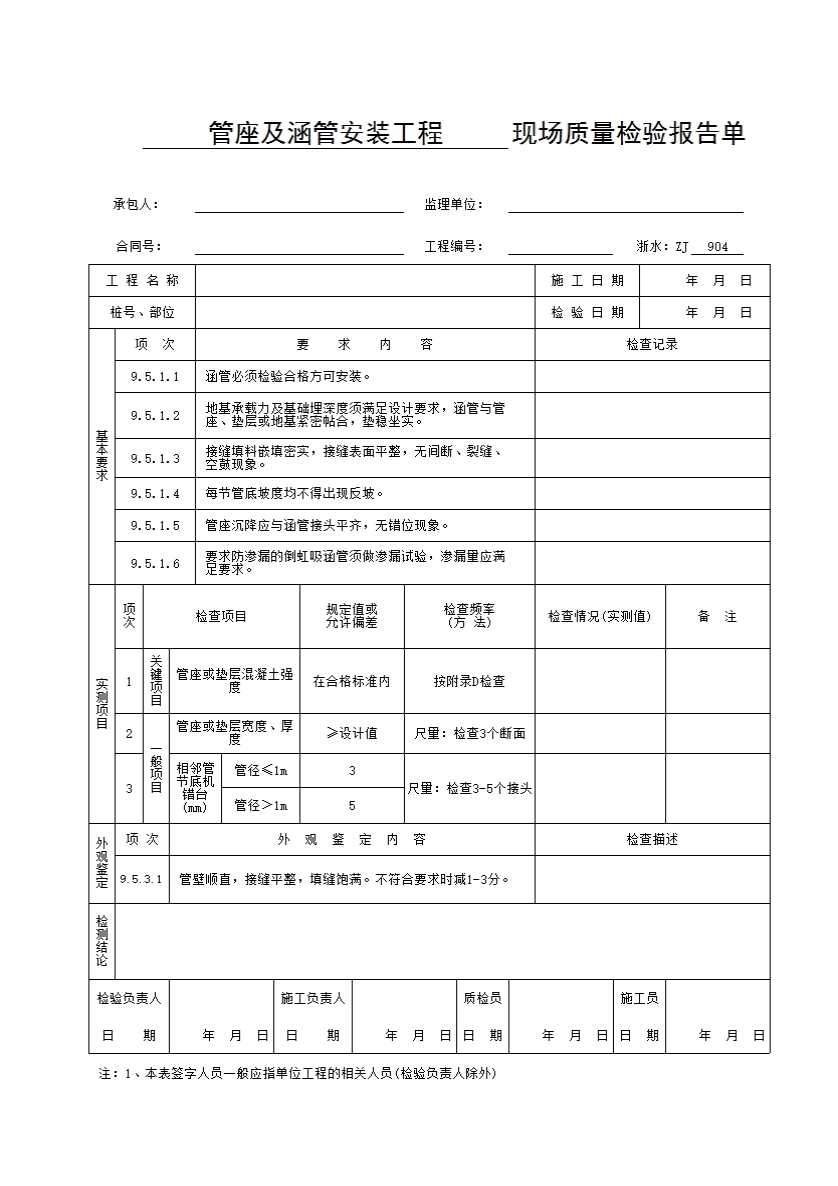 浙水:ZJ904 管座及涵管安装工程现场质量检验报告单