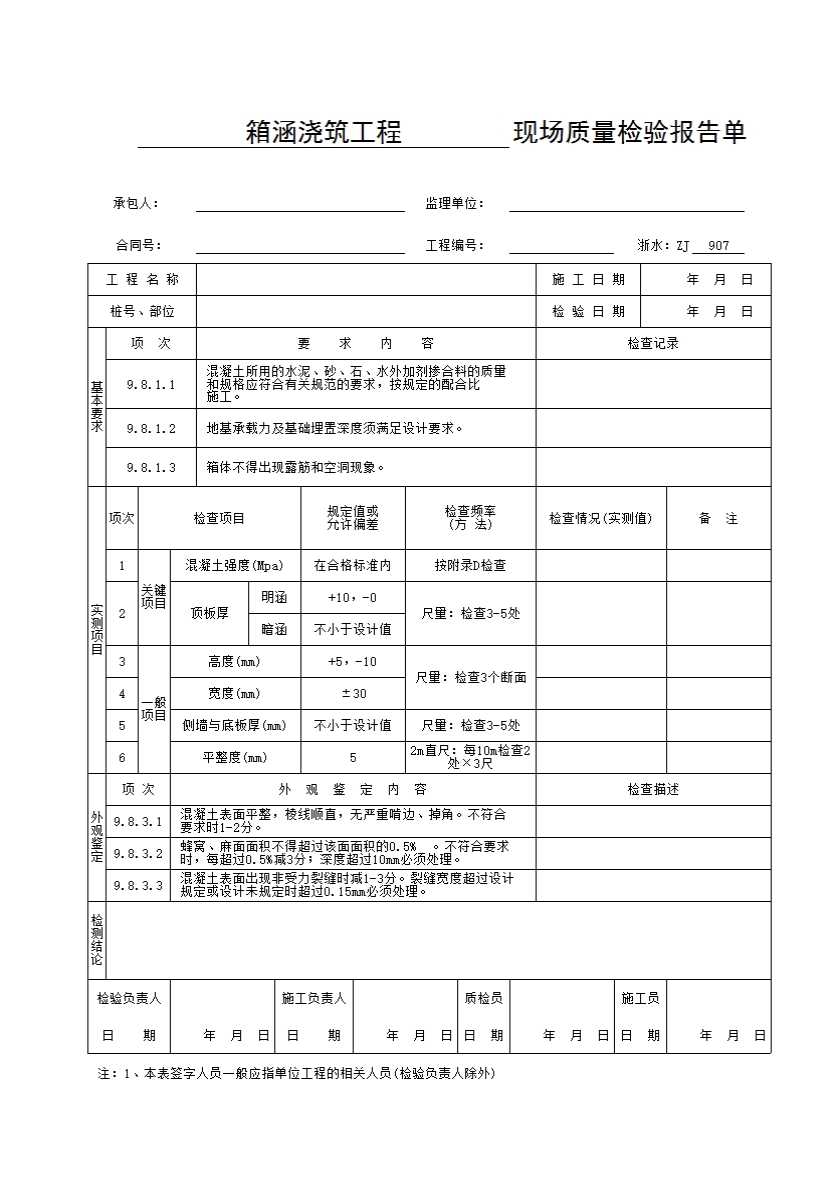 表格名称:浙水:ZJ907 箱涵浇筑工程现场质量检验报告单