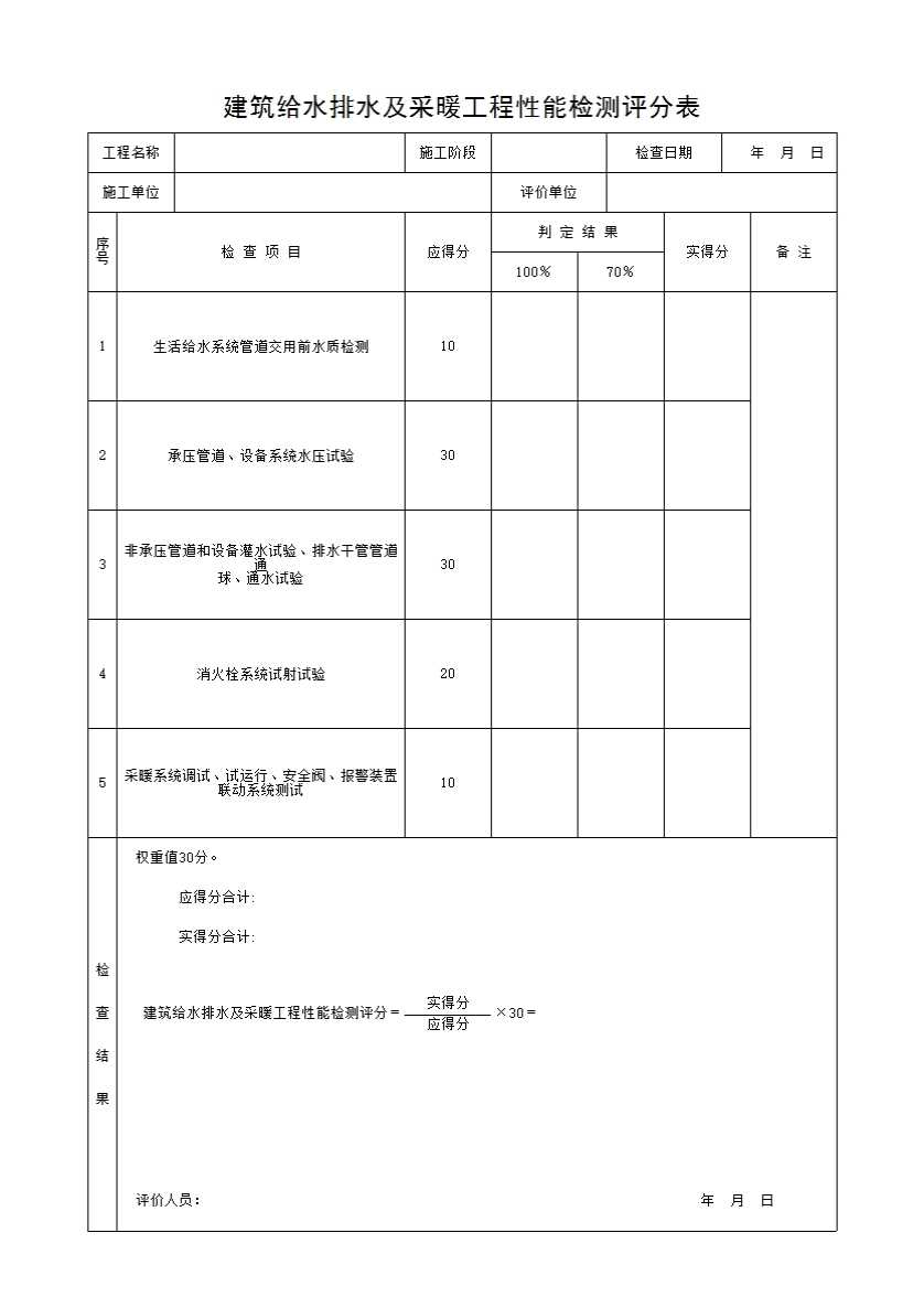 表格名称:建筑给水排水及采暖工程性能检测评分表