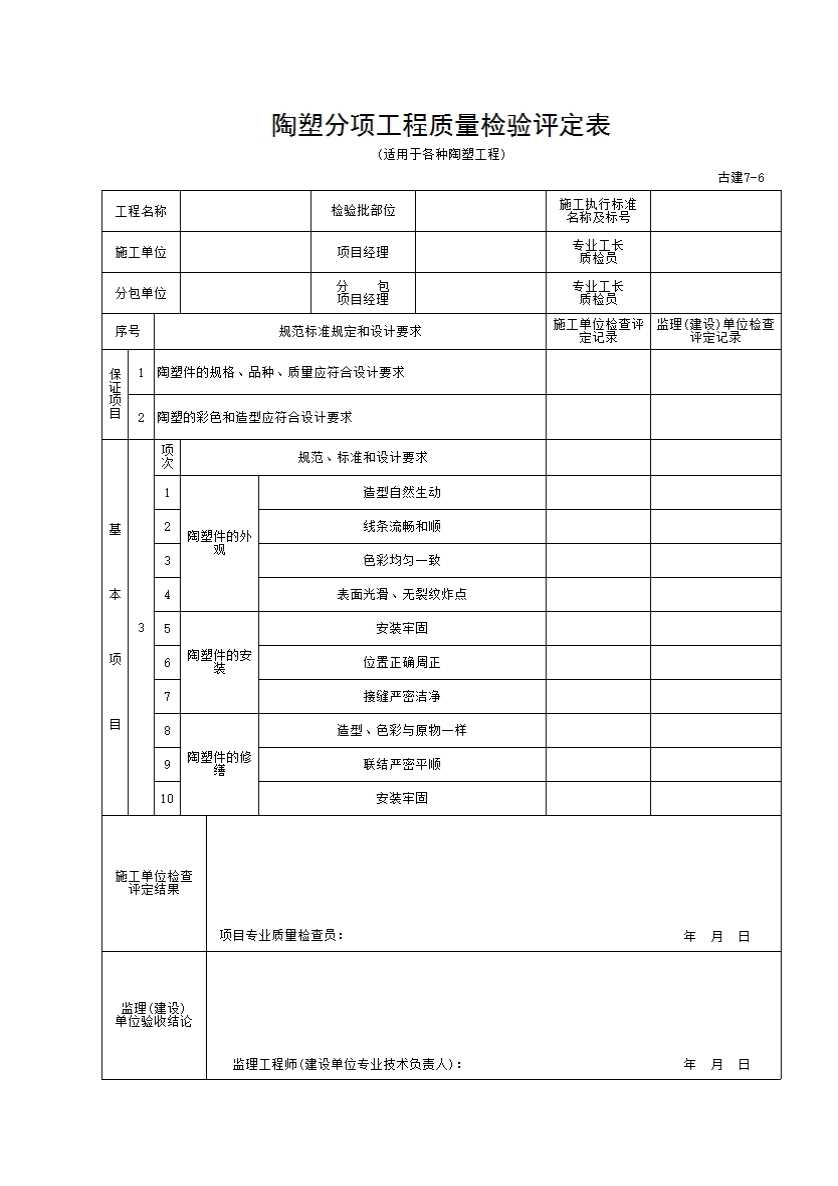 表格名称:古建7-6 陶塑分项工程质量检验评定表
