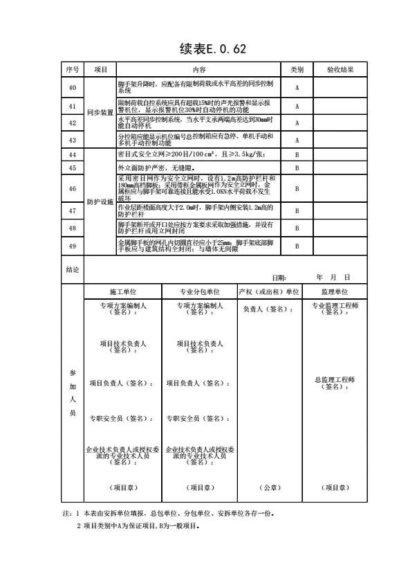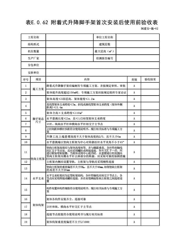 表格名称:表E.0.62 附着式升降脚手架首次安装后使用前验收表