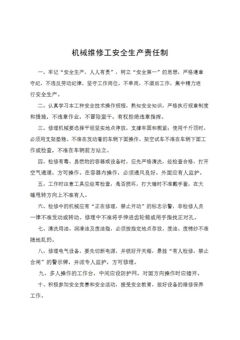 机械维修工安全生产责任制