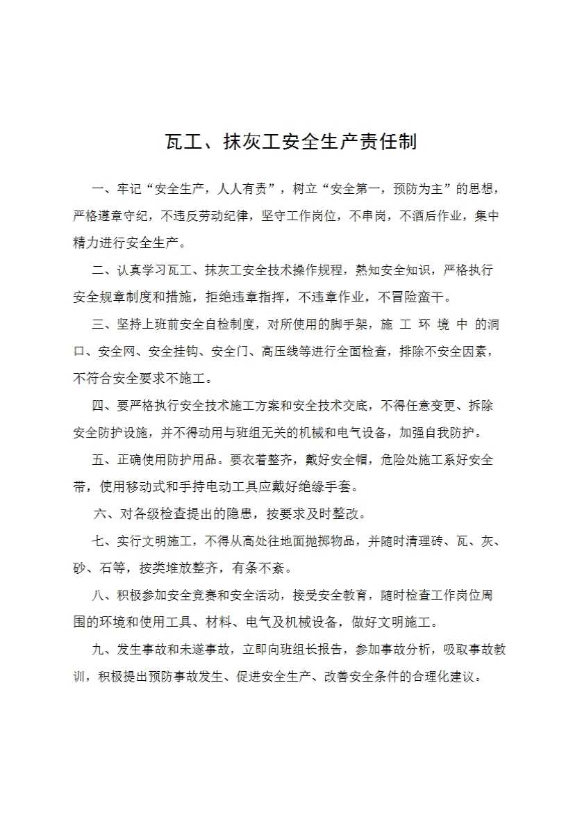 瓦工、抹灰工安全生产责任制