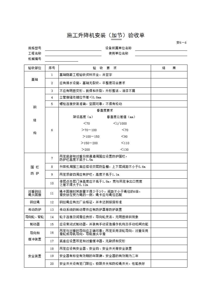 表格名称:施工升降机安装(加节)验收单 安6—6