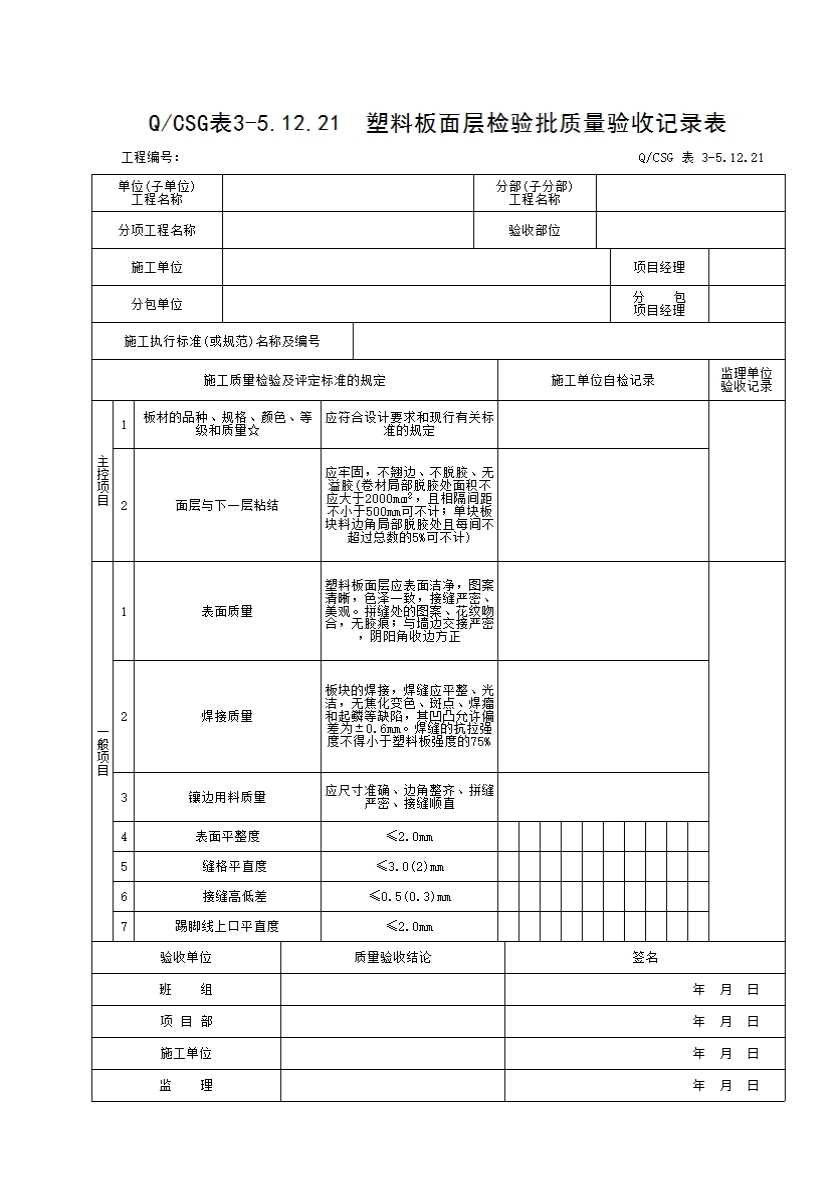 QCSG 表 3-5.12.21 塑料板面层检验批质量验收记录表