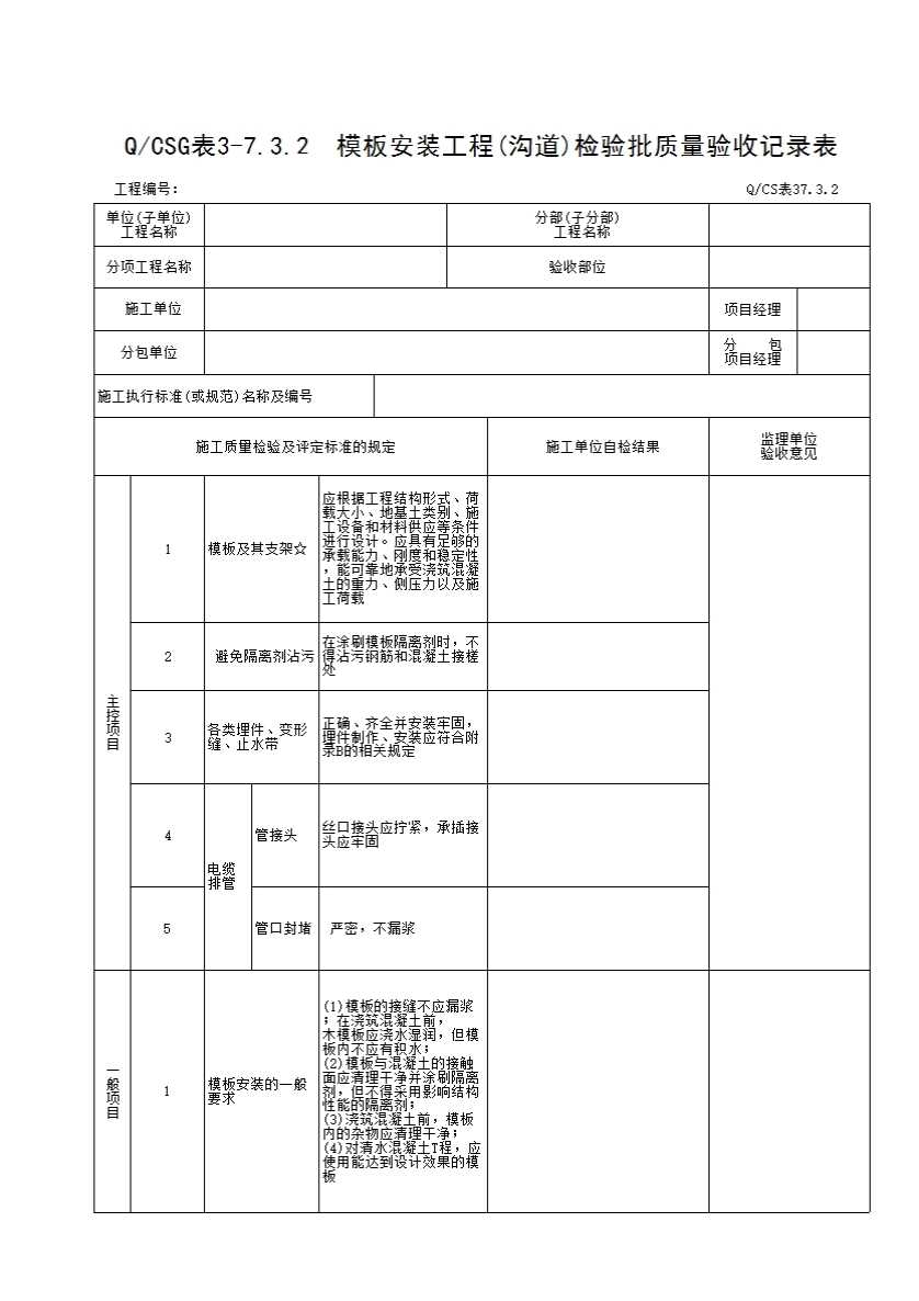 QCSG 表 3-7.3.2 模板安装工程(沟道)检验批质量验收记录表