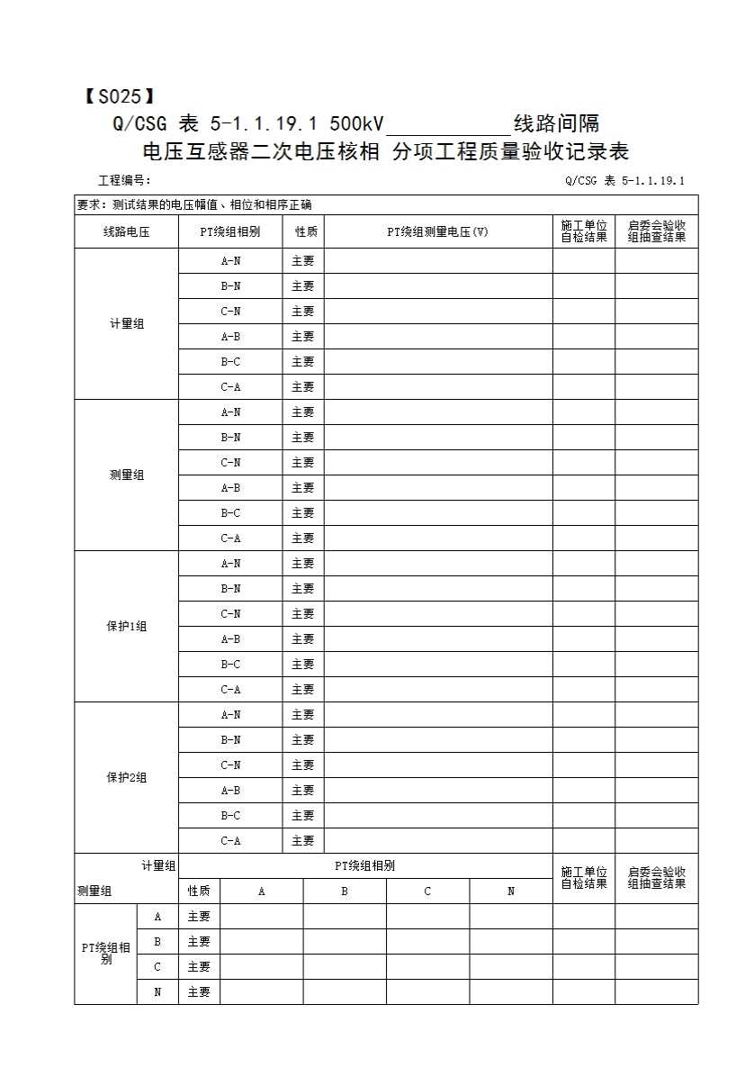表格名称:QCSG 表 5-1.1.19.1 500kV______线路间隔 电压互感器二次电压核相 分项工程质量验收记录表