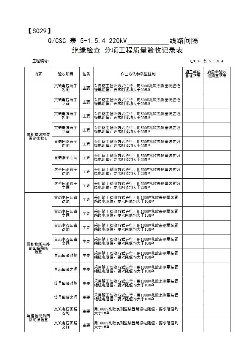 QCSG 表 5-1.5.4 220kV_____线路间隔 绝缘检查 分项工程质量验收记录表