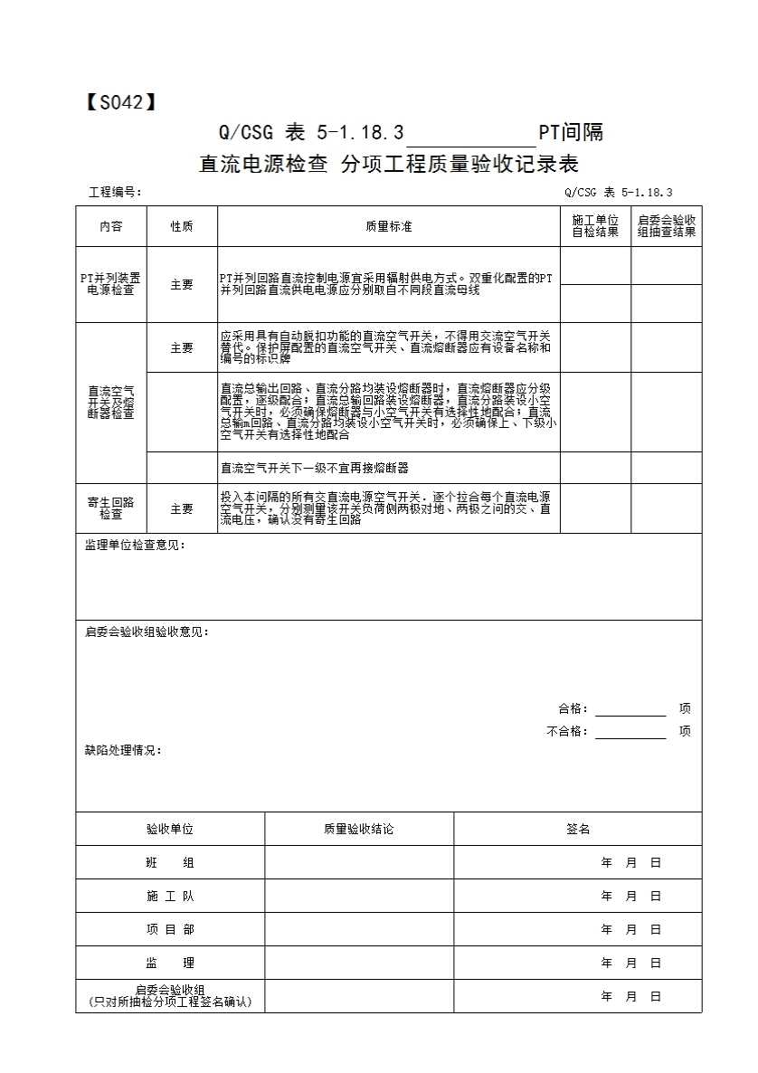 表格名称:QCSG 表 5-1.18.3 ______PT间隔直流电源检查 分项工程质量验收记录表