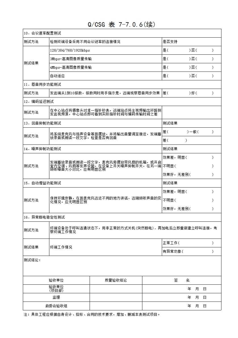 QCSG 表 7-7.0.6 视频会议终端功能测试记录表