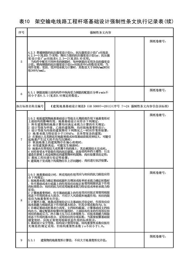 表格名称:表10 架空输电线路工程杆塔基础设计强制性条文执行记录表
