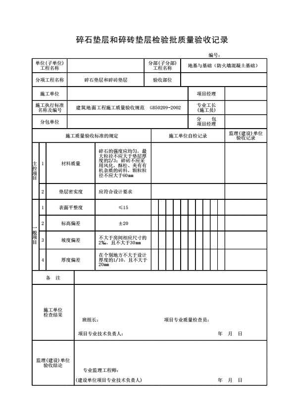 表格名称:碎石垫层和碎砖垫层检验批质量验收记录