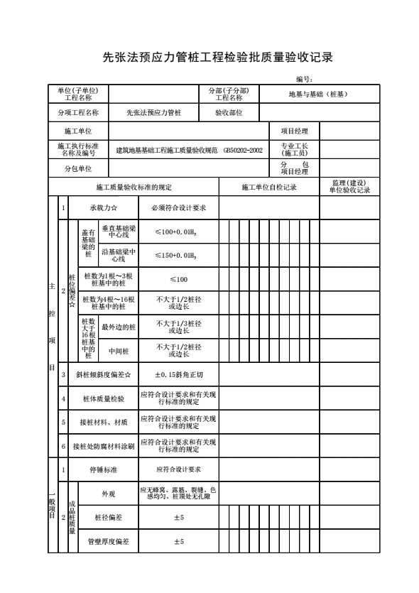 表格名称:先张法预应力管桩工程检验批质量验收记录