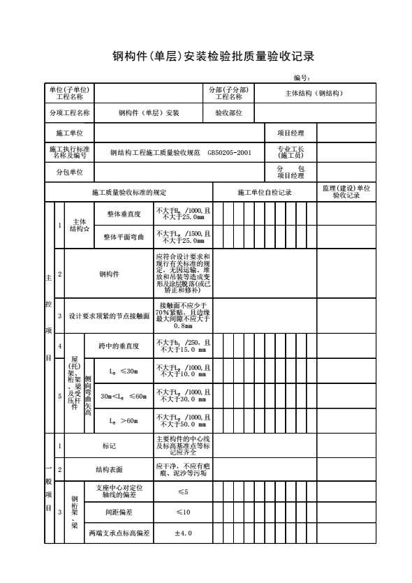 表格名称:钢构件(单层)安装检验批质量验收记录