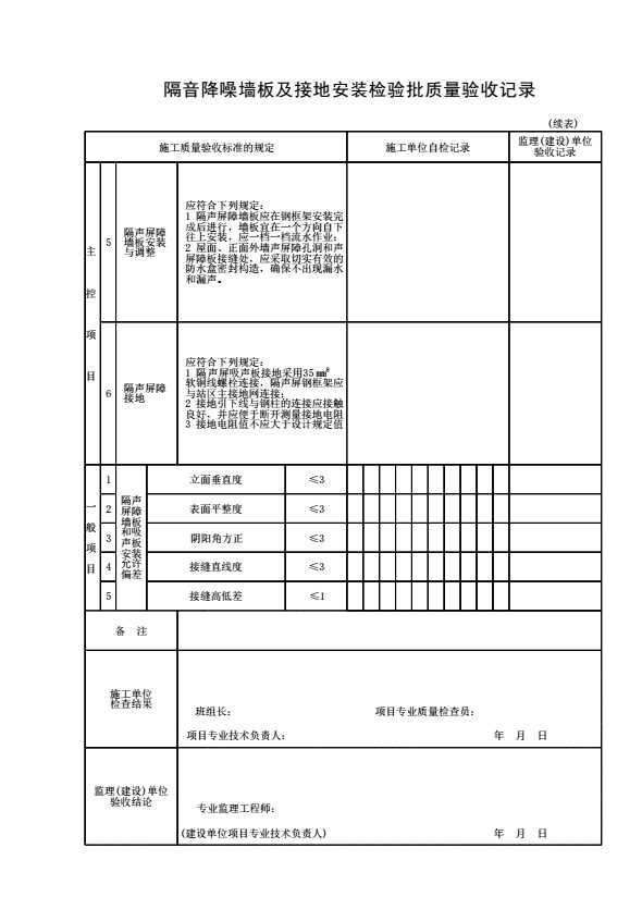 表格名称:隔音降噪墙板及接地安装检验批质量验收记录