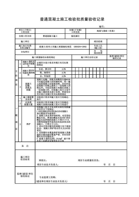表格名称:普通混凝土施工检验批质量验收记录
