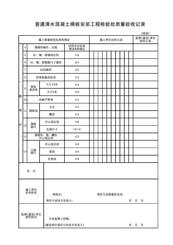 表格名称:普通清水混凝土模板安装工程检验批质量验收记录