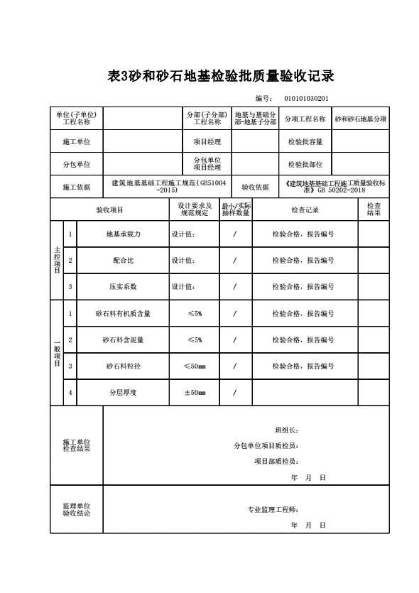 表格名称:010101030201 砂和砂石地基检验批质量验收记录