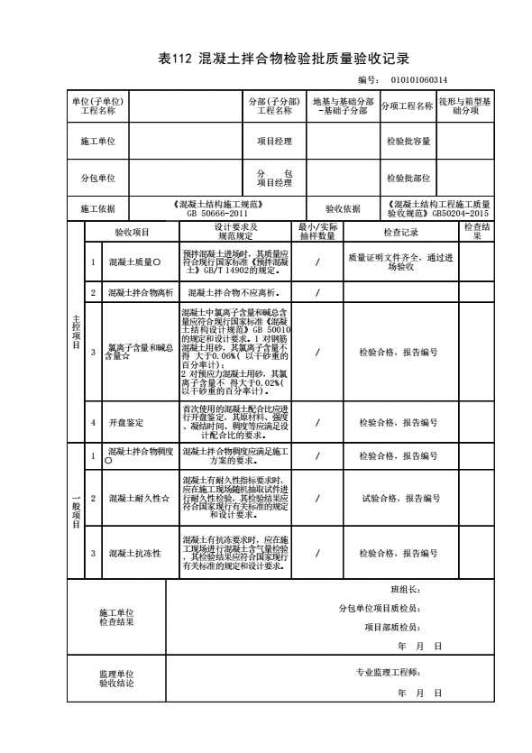 表格名称:010101060314 混凝土拌合物检验批质量验收记录
